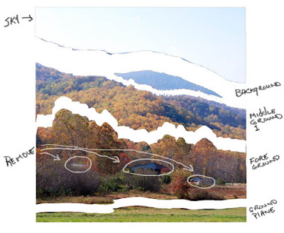Let's look another example, a photo of a landscape scene composed of sky, trees, water, and rock.