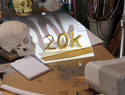The way I do it is to first make all the letters, including the "k," out of four layers of laminated cardboard, cutting them out with a jig saw. I place the letters on a sheet of white paper, and take this photo of them all under a strong light.
