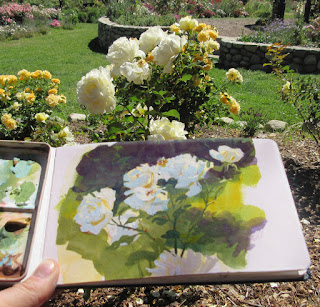 This gouache study takes about 45 minutes. I start with a yellow-ochre underpainting and knock in the darks. Then I paint the cool shadow whites and sunlit whites opaquely.