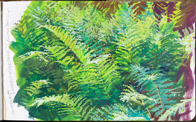 A page of my sketchbook is already primed in casein with a color called "vegetable green" or "parent green." This is the standard hue of the transmitted light that filters through new grass or spring foliage. My intention is to cover up over most of the underpainting, but to let it peek through in places.