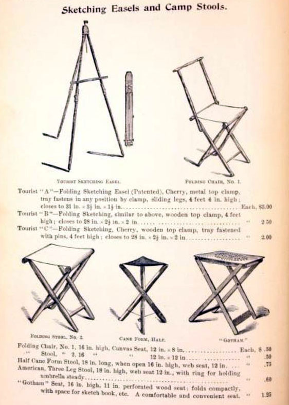This tripod easel and these stools are typical of what plein-air artists would use in the 1890s.