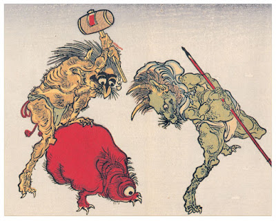 These are great. Yokai, the japanese folklore monsters, are really central to much of japanese art, including literature, manga, anime and traditional painting. There's an American printmaker, David Bull, who's made a name for himself in Japan exploring some of that. Love his work! Check him out at http://woodblock.com/