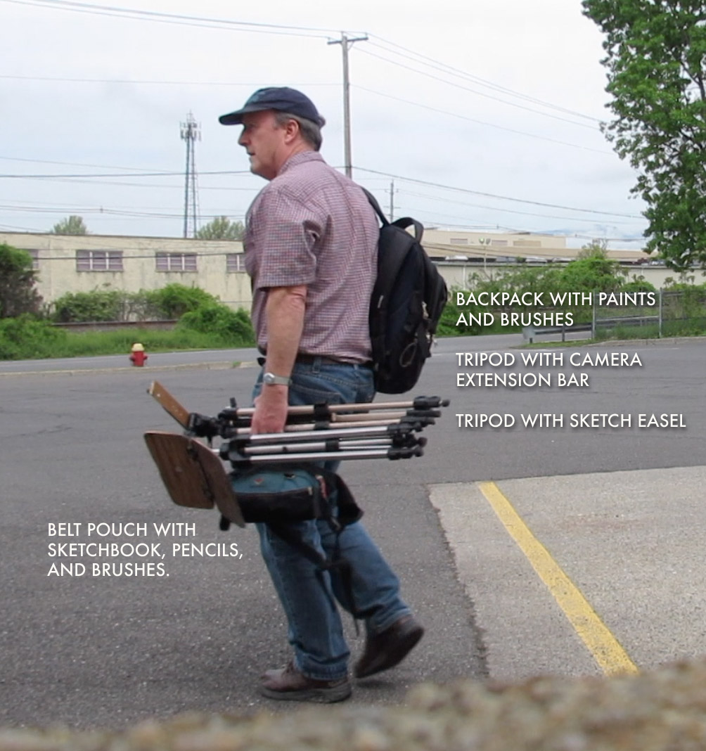 I use two tripods, one for the sketch easel, and the other for the camera, which is held out on an extension bar. The camera I'm using is a Canon EOS M6 mirrorless, which has a built in time lapse function.